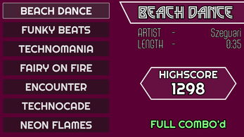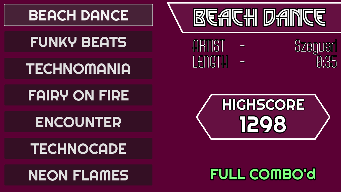 POST JAM UPDATE: The 2.0 update adds 7 new playable songs to the game, including the entirely original song "Future Skies" and its demo version. This update also include quality of life improvements over the original jam version, including less strict beat timings and automatically saving your highscores & perfect clears.